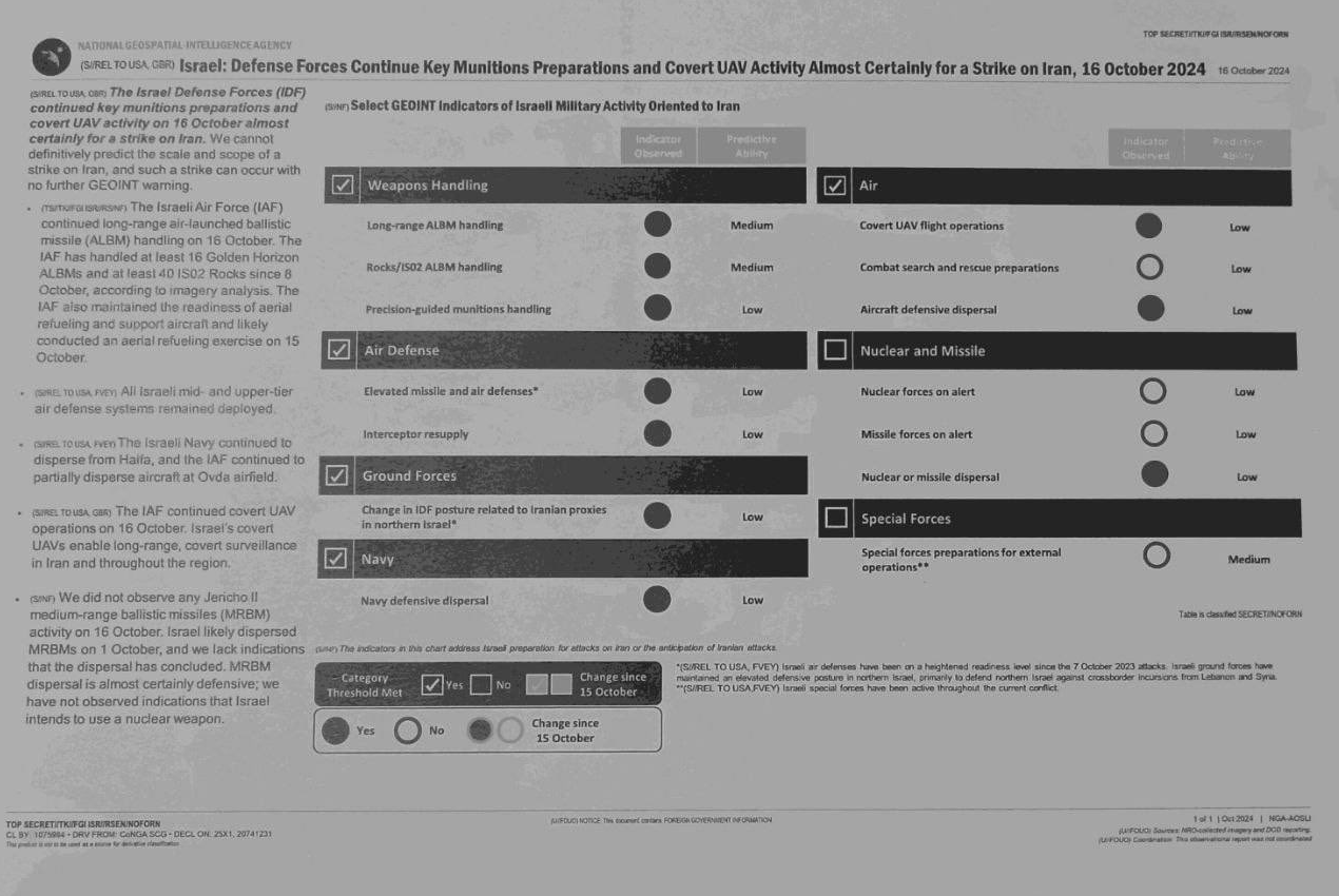 The apparently leaked documents describe heightened Israeli movements of air-launched ballistic missiles, as well as covert drone surveillance operations. The U.S. documents state these Israeli military operations are “almost certainly” part of the preparations for Israel to strike Iran.